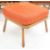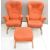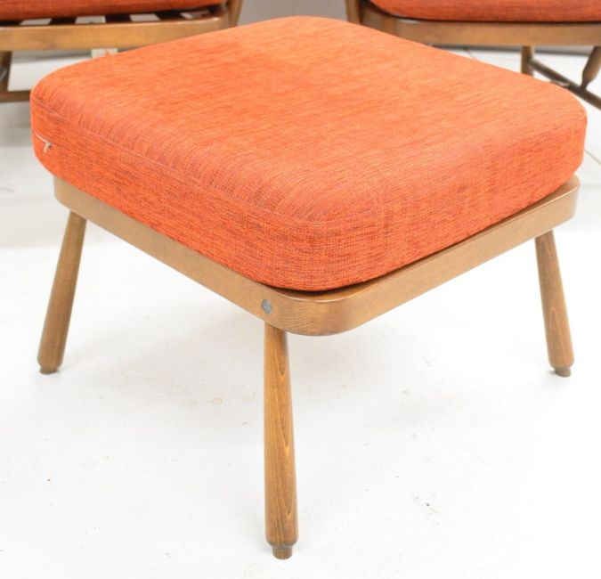 Ercol Evergreen elm furniture suite with red upholstery comprising two-seat sofa, two arm chairs, magazine rack and a footstool, length of sofa 142cm