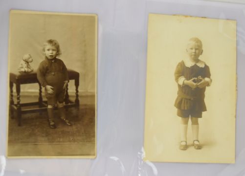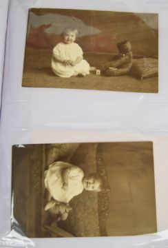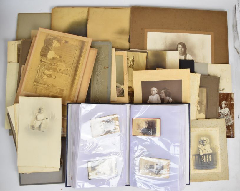Over two hundred Victorian, Edwardian and later photographs of children, many with toys including trains, bicycles, soft toys, dolls, boats, books, playing cricket, at the beach, on cart pulled by a goat, on a rocking horse and in fancy dress, stereoscope cards, several school groups, children with chickens and geese, a young boys band and several family groups, various sizes carte visite through to large photographic images on board 50 x 38cm
