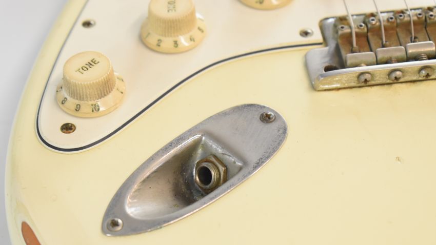Fender Jimi Hendrix tribute Stratocaster in aged off-white finish with maple neck, black dot inlays and single coil pickups, made in USA, 1997, serial no. TN700073, in fitted Fender case with original tags, purchase receipt and accessories.