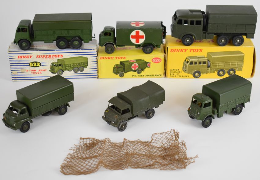 Six Dinky Toys diecast model military vehicles, three in original boxes.