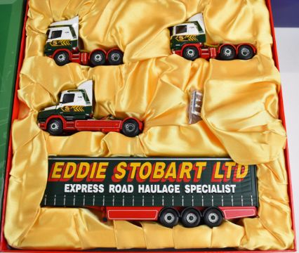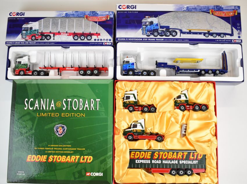 Three Corgi diecast model Scania HGV boxed sets comprising Hauliers of Renown and Scania @ Stobart lines, all in original boxes.