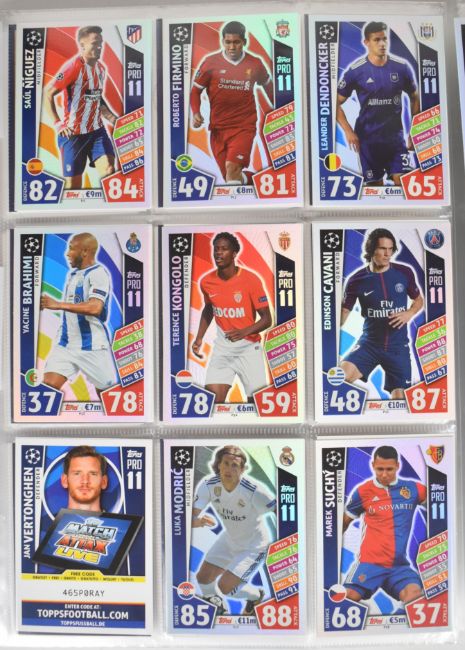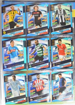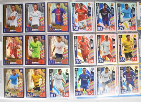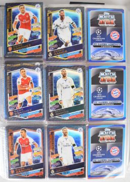 Topps Match Attax UEFA Champions League 2016/17 and 2017/18 football trading cards appearing complete or near complete base sets with a quantity of limited edition cards for Lionel Messi, Cristiano Ronaldo, Sergio Ramos, Alexis Sanchez, Thomas Muller, David Luiz and Mohamed Salah, together with signature/autos for Arjen Robben, Nicholas Otamendi, Eric Dier, Kieran Trippier and John Stones, in two official binders.