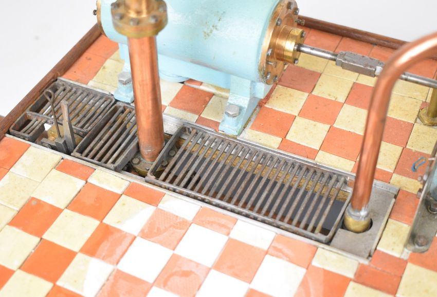Exhibition standard Southworth Corliss valve live steam cross compound mill engine, the Corliss valved cylinder valve gear being controlled by a working governor and fed from a pedestal mounted main steam valve, the low pressure cylinder having twin drain cocks operated from a quadrant and the steam then feeding into a condenser, the whole engine having brass cup oilers to the eccentrics, slides and main bearings and lubricators to both big ends allowing them to be oiled without stopping the engine, the engine driving a spoked pulley and spoked flywheel with barring teeth, the barring lever and stand both being present, the flywheel being guarded by miniature hand rails, all on a miniature tiled base, overall size 89 x 47 x 29cm, together with a set of drawings for the engine and booklet
