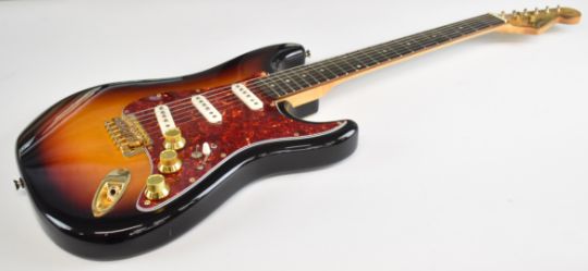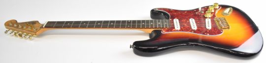 Fender Stratocaster copy electric guitar in sunburst finish with rosewood fretboard, pearlescent inlays, gold colour hardware and single coil pickups.