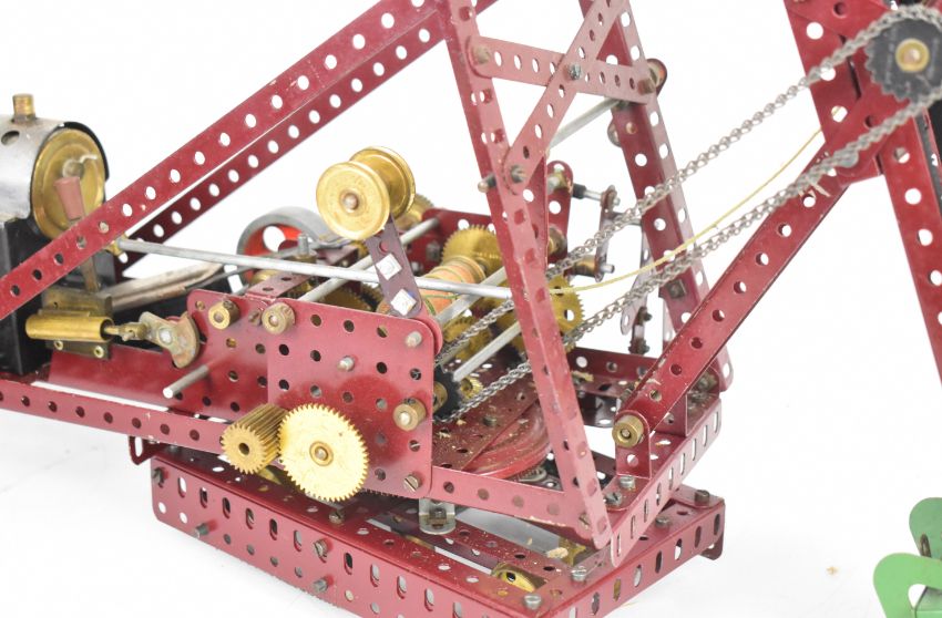 Meccano live steam model of a rail mounted excavator, running on 45mm track, the Mamod Meccano MEC1 steam engine with lever controls actuating the single cylinder oscillating engine reverser, slew, lift, reach and drive, overall length 59cm