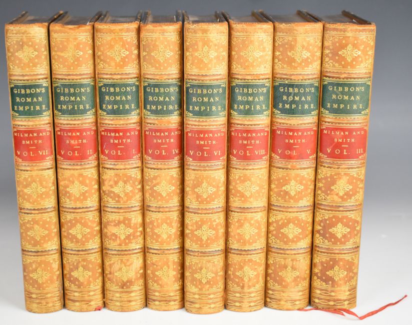 [Fine Bindings] The History of The Decline & Fall of The Roman Empire by Edward Gibbon with Notes by Dean Milman and M.Guizot, published John Murray 1887, New Edition in 8 volumes with additional notes, portrait and maps, bound in contemporary full tree calf bindings with gilt ruled borders and central gilt shield device on covers, raised bands with decorated gilt panels and coloured leather title labels on spines, marbled endpapers and edges (8)