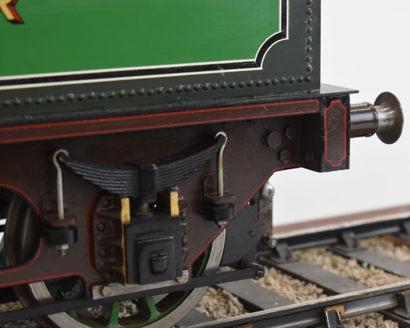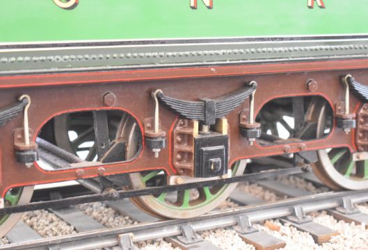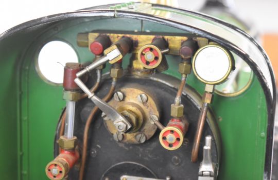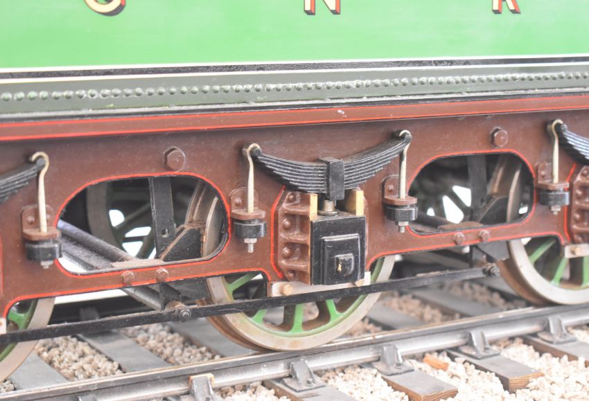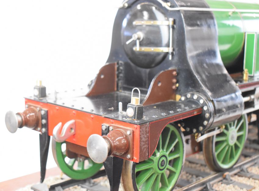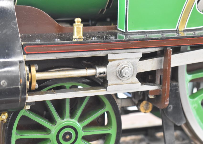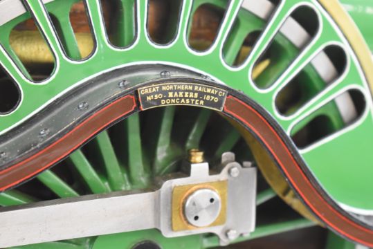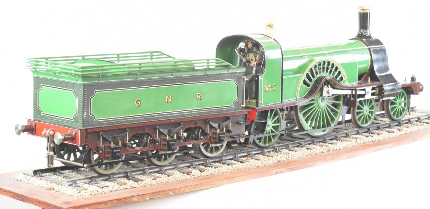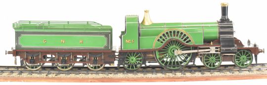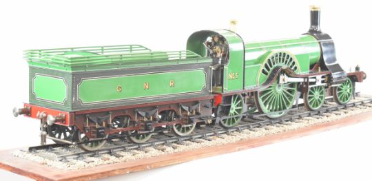 Exhibition quality 5 inch gauge GNR 4-2-2 Stirling Single live steam tender locomotive built by John "Jack" Savage of Oakengates, Shropshire. The copper boiler having 0-150psi pressure gauge, water level gauge glass and single safety valve, fed by an axle driven feed pump and hand pump in the tender. The twin outside cylinders having drain cocks and with inside Stephenson's link reversing gear controlled from a quadrant in the cab. All axles and buffers being sprung, the locomotive driving and trailing wheels having steam brakes, the tender having a screw operated handbrake. Overall length 146cm. Jack Savage was born in 1901 and had wide ranging interests including horticulture, photography and engineering, he worked at John Maddock and Company, a iron foundry where he was foreman. He began by building a 3½ inch gauge Royal Scot, then a 5 inch gauge Hall, then a 5 inch gauge Simplex and finally this Stirling Single, all being offered in this auction.
