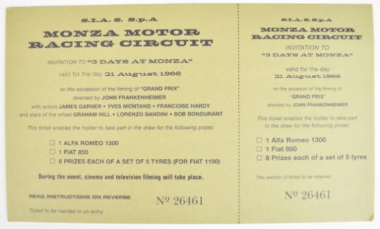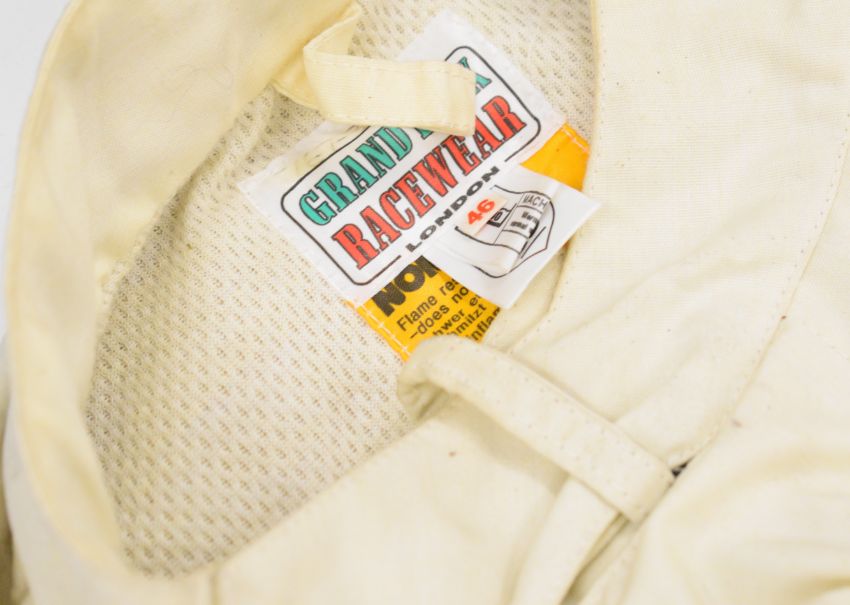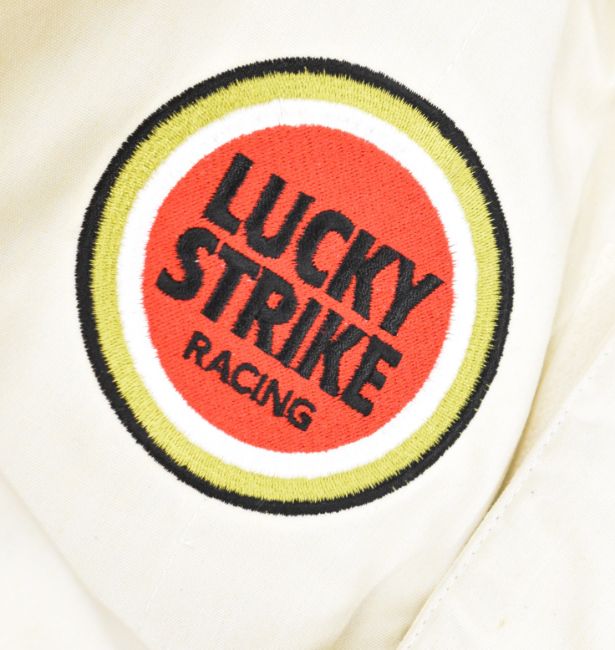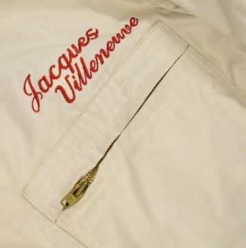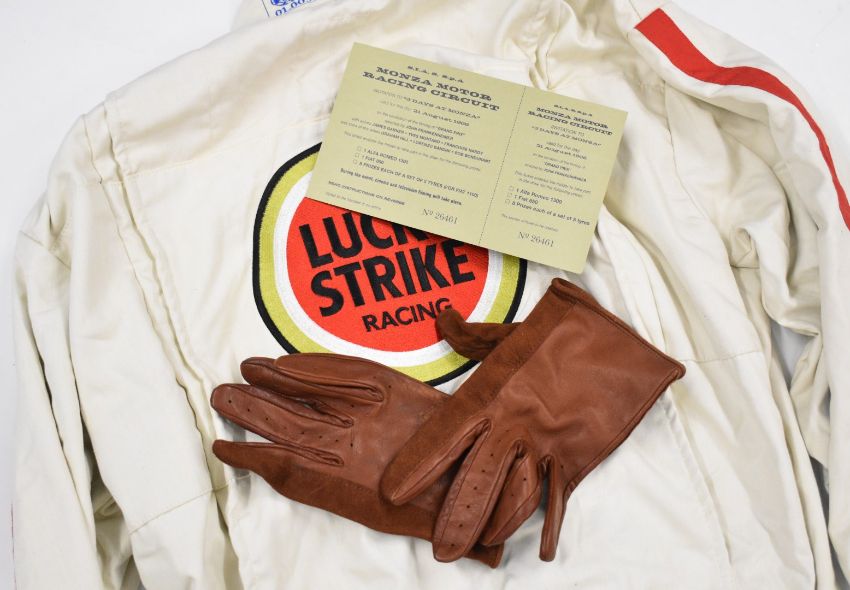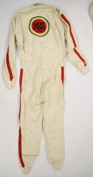 [Film Memorabilia] Motor racing overalls worn by Hollywood legend James Garner and Formula One racing driver Jacques Villeneuve during their recreation at Monza on November 10th 1999 of the Academy Award-winning 1966 film 'Grand Prix', arranged as an exclusive media day by Lucky Strike Racing, and featuring a full day's itinerary where media were given access to the track, cars and garages and to the two drivers themselves, Garner and Villeneuve. The two pairs of red and white racing overalls have the driver’s names embroidered above breast pockets and Lucky Strike patches sewn to the front and back. Also included are two pairs of Autostorica leather covered racing shoes, a pair of leather and suede gloves, a polished metal covered album of approximately forty photographs produced as a keepsake of the day with images of Garner and Villeneuve wearing the racing overalls and action shots on the race track etc and a folder of information about the event, the drivers and background information to the original 1966 film and a large brochure about the film and the related merchandise available