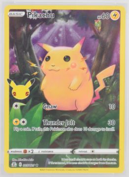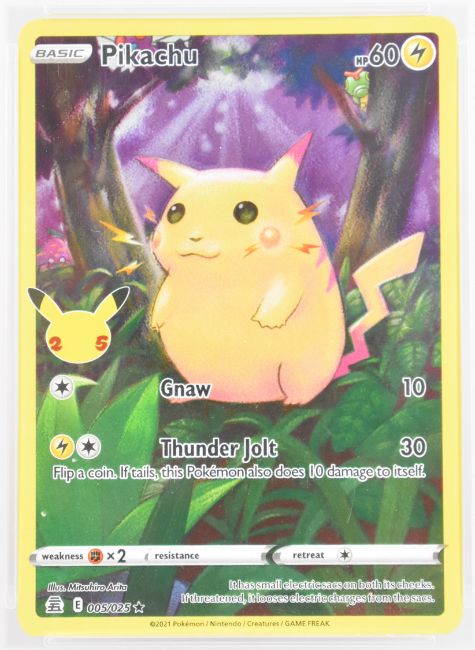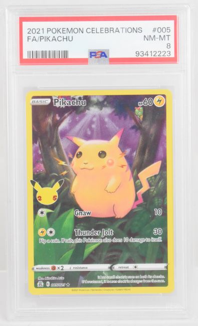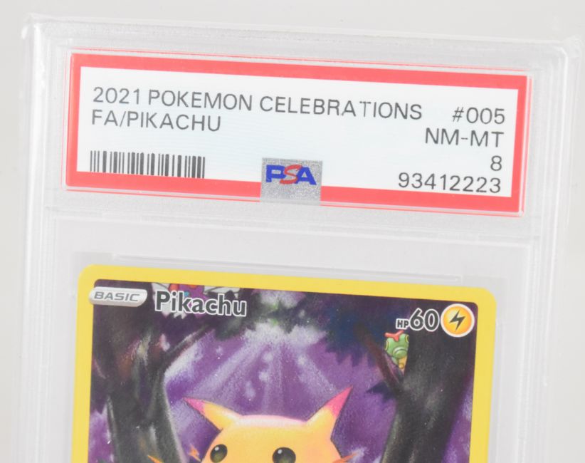 Two Pokémon 'Pikachu' Celebrations Full Art 005/025 trading cards, 2021, PSA graded 7 NM and 8 NM MT, 117095116 and 93412223.