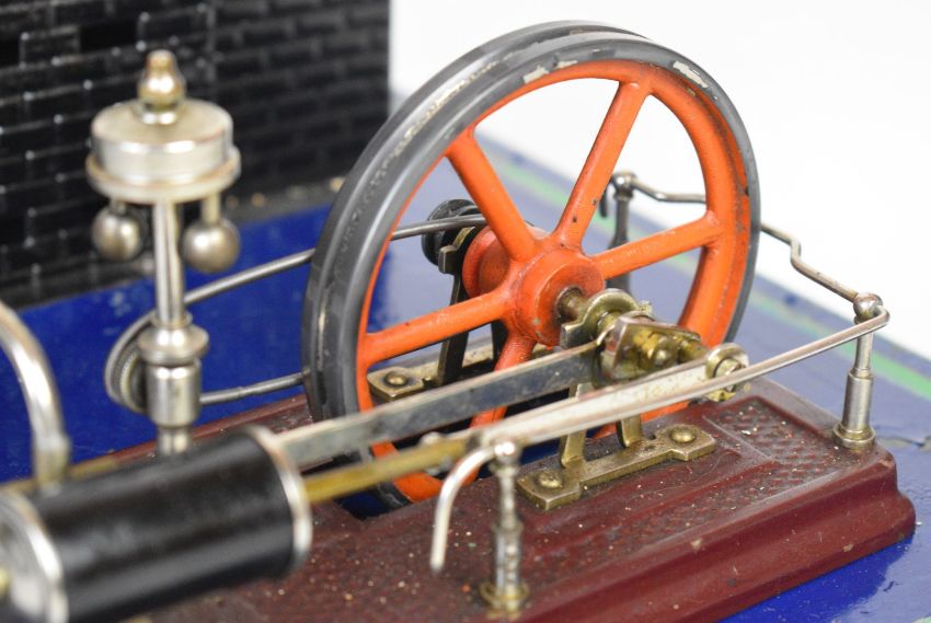 Bing live steam engine with water level glass, whistle, manometer or pressure gauge and faux brick base and chimney, the single cylinder slip eccentric engine having dummy governor and handrails, length of base 31cm