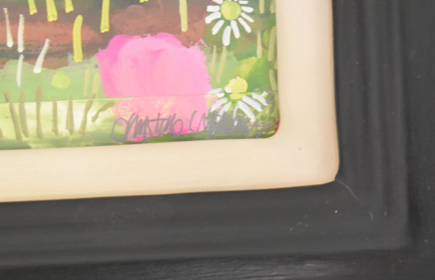 Christine L. McArthur RSW (Scottish born 1953) acrylic still life study white cup among flowers, signed lower right, 14 x 14cm, in black painted frame