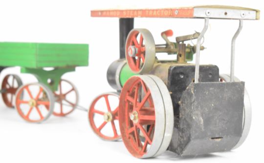 Mamod TE1A live steam traction engine, together with a four wheel twin axle trailer and a lumber trailer