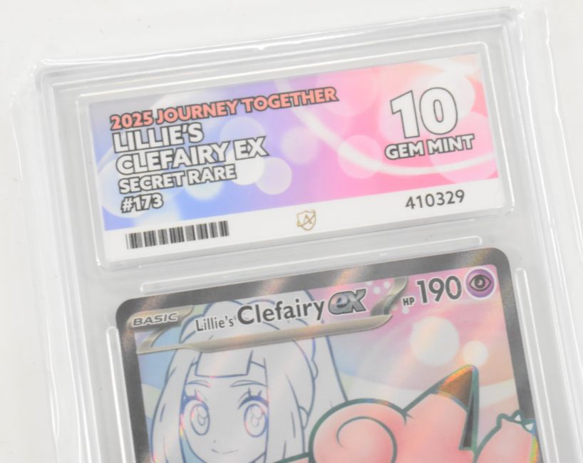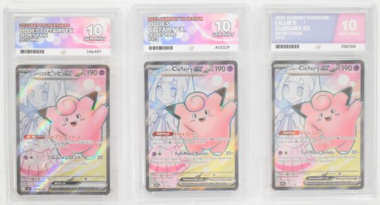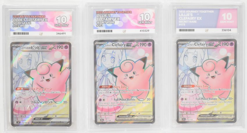 Three Pokémon 'Lillie's Clefairy' EX Secret Rare 173/159 and 115/100 trading cards, 2025, English and Japanese printings, Ace Grading 10, Gem MT. 336104, 346491 and 410329.