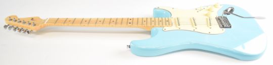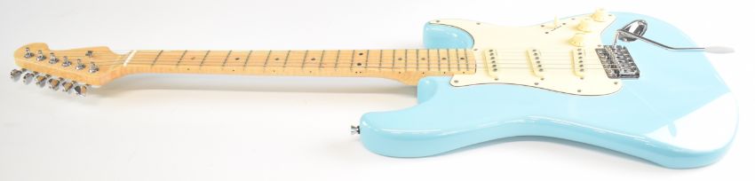 Fender Stratocaster style electric guitar in Laguna blue finish with maple neck, pearlescent inlays and Alnico V pickups, marked Fender on rear neck plate but no other serial numbers or markings present.