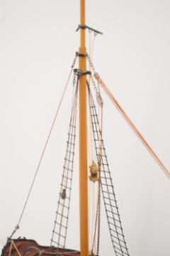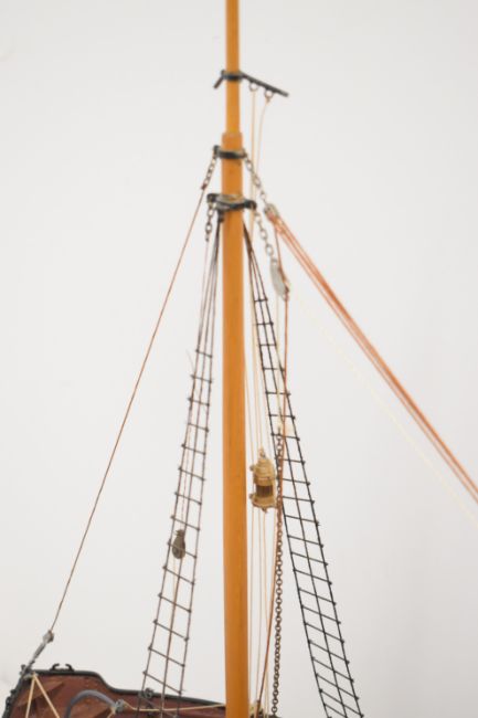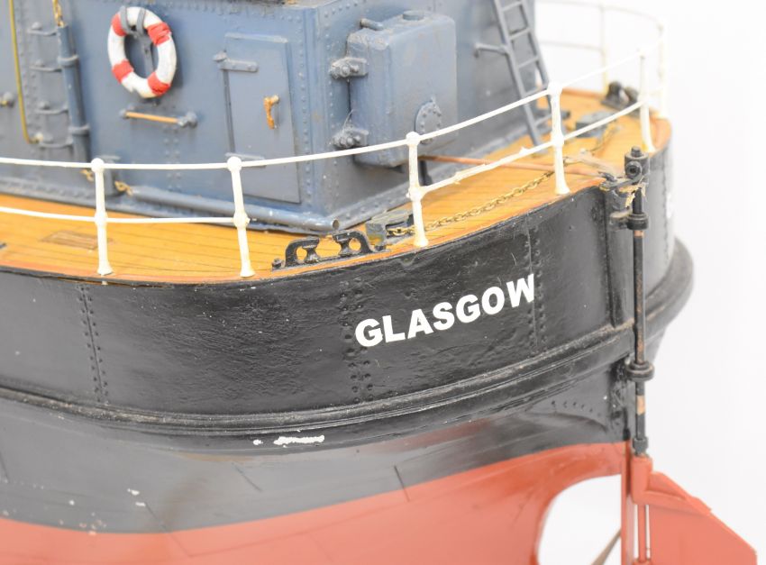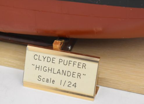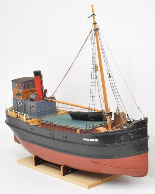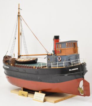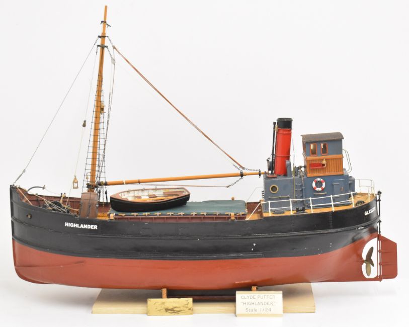 Clyde puffer model steam boat built by Bill Hunt, with fibreglass hull and detailed deck house, wheelhouse, windlass and mast, having electric motor and rudder radio control operation, overall length 90cm