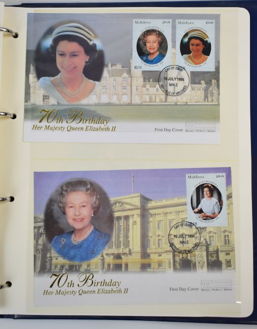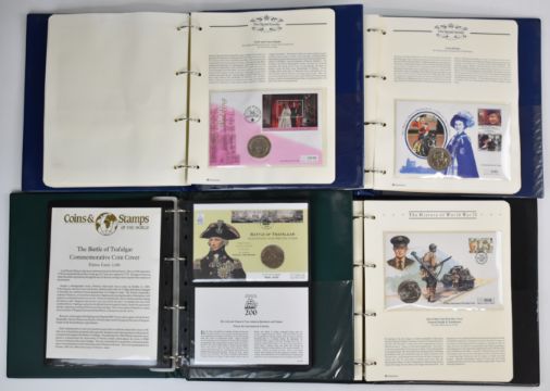 Fifty four coins housed in four albums of coin / stamp covers including Royal Family, WW2 and Trafalgar, silver proof £5 coin Queen Elizabeth's II's 70th birthday, etc