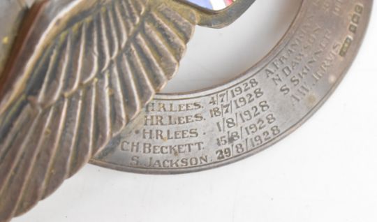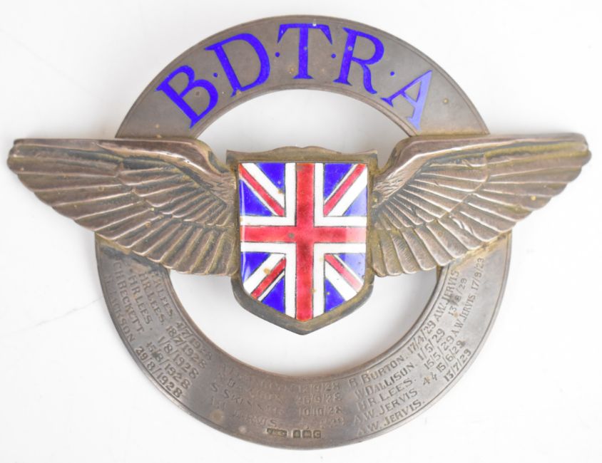 British Dirt Track Riders Association (Speedway) enamelled hallmarked silver armlet with Union Jack decoration, hallmarked for Birmingham 1927 and maker's mark Gorham Manufacturing Co. The armlet was worn by the winner of the competition's 1928-1929 season and a printed roll call is on the bottom of the armlet, this would have been worn in conjunction with the 'Golden Helmet' Speedway Trophy, diameter 14cm, weight 142g