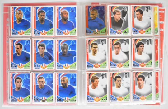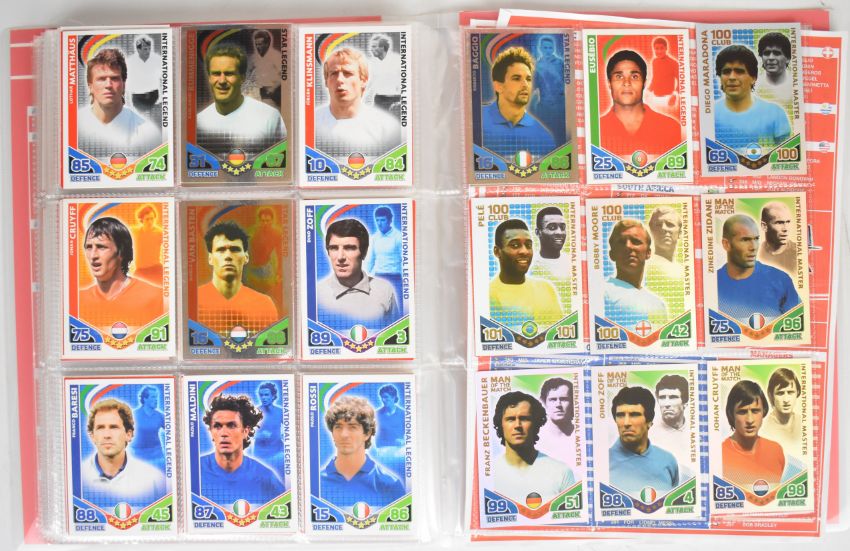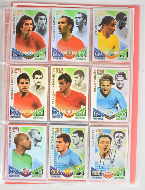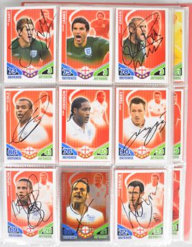 Topps Match Attax England 2010 football trading card set appearing complete including 24 signed/autographed cards for Joe Hart, John Terry, Wayne Rooney, Ashley Cole, Rio Ferdinand, Wayne Bridge, Frank Lampard, Aaron Lennon, Peter Crouch, Peter Shilton, Michael Ballack, Zico, Fabio Capello and others, in official folder with checklist.