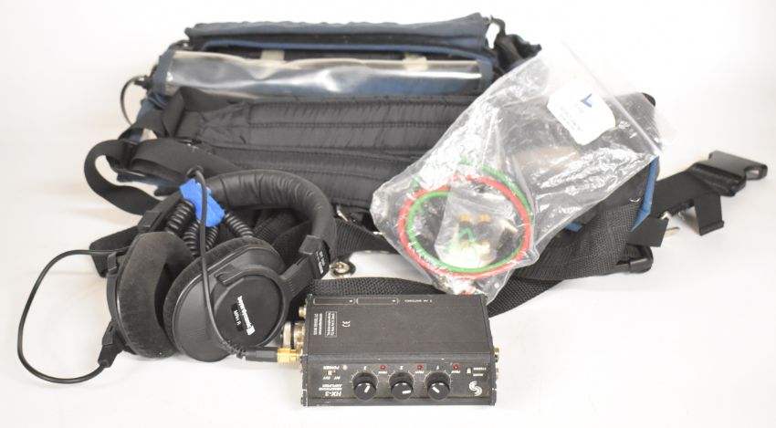 Sound Devices HX-3 headphone distribution amplifier with Beyerdynamic MRH-R headphones, soundman harness and carry case.