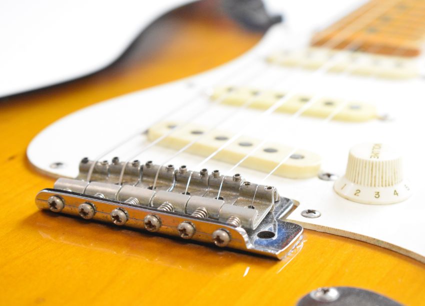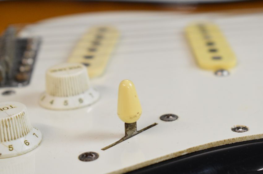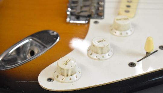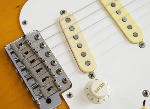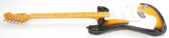 Fender Stratocaster electric guitar in sunburst finish with maple neck/fretboard and three single coil pickups, made in Japan 1982, early serial number JV00330.