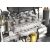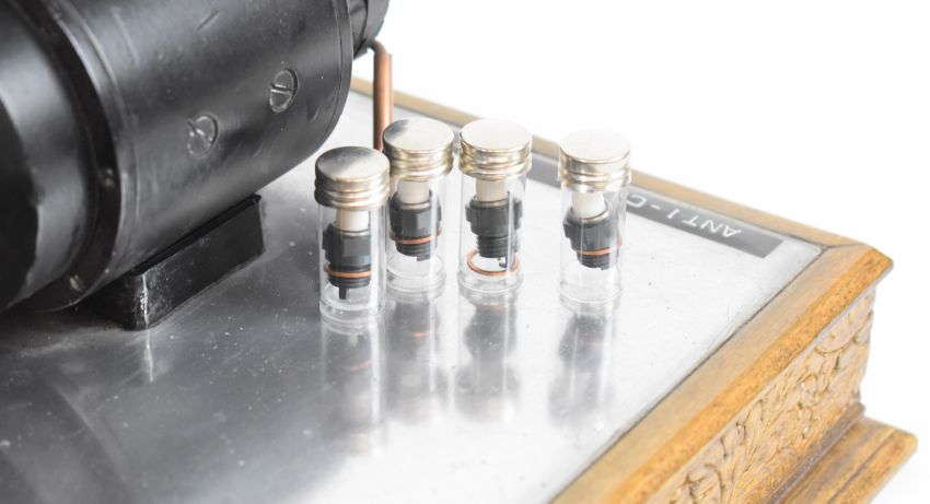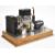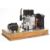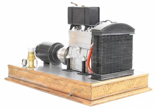 Edgar Westbury Seal four cylinder model petrol engine driving a generator the engine having belt driven water pump and cooling fan, miniature distributor and carburettor with brass float bowl and lever controls of both throttle and mixture, mounted with fuel tank and radiator under a perspex cover, overall length of base 53cm
