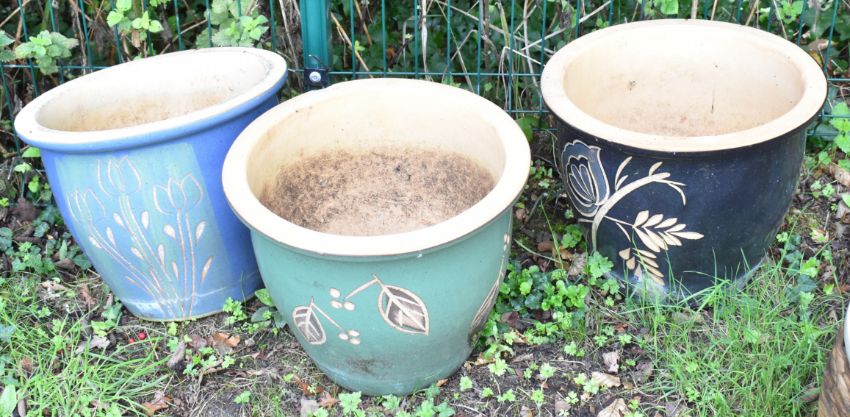 Three coloured jardinières / garden planters with floral decoration, D39 x H32cm