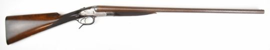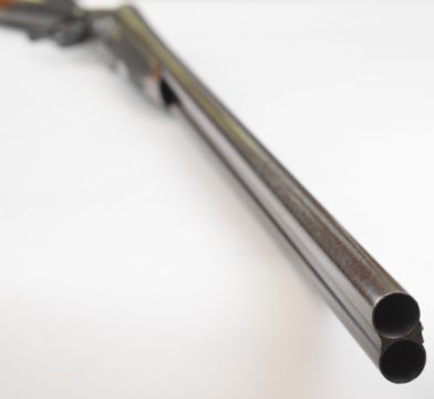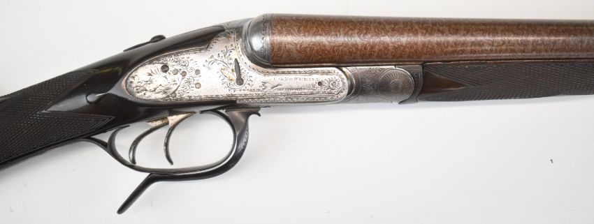C G Bonehill 12 bore side by side shotgun with push forwards underlever, cocking indicators, scenes of dogs and birds to the sidelock plates, chequered semi-pistol grip and horn tipped forend, carved teardrop to the wrist, vacant cartouche to the underside of the stock, double trigger and named 30 inch faux Damascus barrels choked cylinder, overall length 118cm, length of pull 36.5cm, serial number 873. PLEASE NOTE THAT A VALID RELEVANT SHOTGUN CERTIFICATE IS REQUIRED TO VIEW OR PURCHASE THIS LOT AND FOR ALL SHOTGUNS OR RIFLES PLEASE ENSURE YOU HAVE THE RELEVANT CERTIFICATE BEFORE BIDDING.