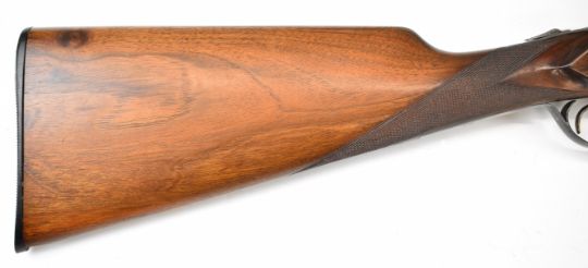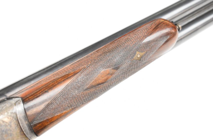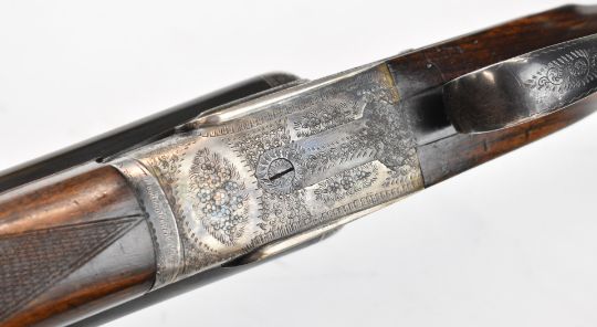 Spanish 12 bore side by side sidelock ejector shotgun with engraved locks, underside, trigger guard, top plate, thumb lever and fences, chequered grip and forend, double trigger and named 27.5 inch barrels choked ½ and ¾, overall length 111cm, length of pull 35cm, serial number 94757. PLEASE NOTE THAT A VALID RELEVANT SHOTGUN CERTIFICATE IS REQUIRED TO VIEW OR PURCHASE THIS LOT AND FOR ALL SHOTGUNS OR RIFLES. PLEASE ENSURE YOU HAVE THE RELEVANT CERTIFICATE BEFORE BIDDING.