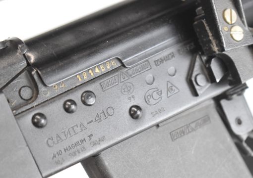 Kalashnikov Saiga .410 assault rifle style semi-automatic FAC shotgun with textured pistol grip and stock, multi-shot magazine, sling mounts, 3-9x42 scope and 24 inch barrel, overall length 108.5cm, serial number 1214526. PLEASE NOTE THAT A VALID RELEVANT FIREARMS CERTIFICATE IS REQUIRED TO VIEW OR PURCHASE THIS LOT AND FOR ALL SHOTGUNS OR RIFLES. PLEASE ENSURE YOU HAVE THE RELEVANT CERTIFICATE BEFORE BIDDING.