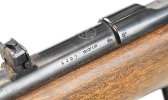 Krico .22 bolt-action rifle with chequered semi-pistol grip, multi-shot magazine, sling mounts, folding leaf sights and 14 inch barrel, overall length 81cm, serial number 8990. PLEASE NOTE THAT A VALID RELEVANT FIREARMS CERTIFICATE IS REQUIRED TO VIEW OR PURCHASE THIS LOT AND FOR ALL SHOTGUNS OR RIFLES. PLEASE ENSURE YOU HAVE THE RELEVANT CERTIFICATE BEFORE BIDDING.