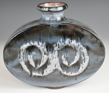 Studio pottery including Llangollen moon flask, Patrick Courcy or Courcey face mask, pedestal chalice, mark indistinct and a figure of a nun by Sharon Mitrie, tallest 30cm