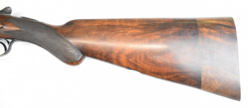 George Bate Featherweight 12 bore side by side ejector shotgun with gold named and engraved locks, engraved trigger guard, underside, top plate, thumb lever and fences, chequered semi-pistol grip and forend, carved teardrop to the wrist, vacant cartouche to the underside of the stock, double trigger and named 28 inch barrels choked cylinder, overall length 115.5cm, length of pull 39cm, serial number 2146. PLEASE NOTE THAT A VALID RELEVANT SHOTGUN CERTIFICATE IS REQUIRED TO VIEW OR PURCHASE THIS LOT AND FOR ALL SHOTGUNS OR RIFLES. PLEASE ENSURE YOU HAVE THE RELEVANT CERTIFICATE BEFORE BIDDING.