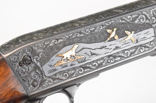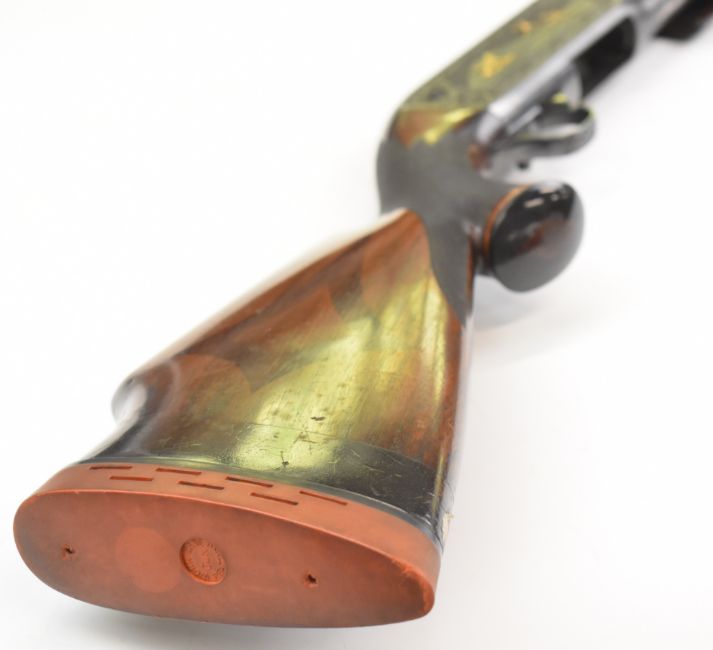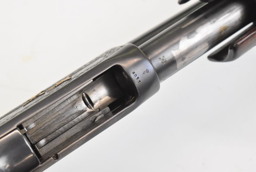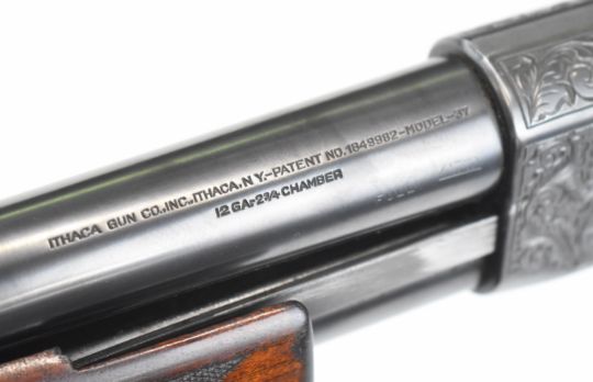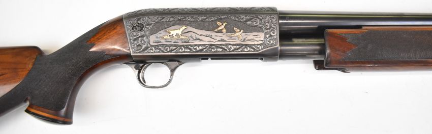 Ithaca Model 37 12 bore 3-shot pump-action shotgun with applied gold dogs and birds to the engraved action, chequered semi-pistol grip and forend, inlaid stock, raised cheek piece and 26 inch barrel with The Poly Choke Co adjustable choke, overall length 116cm, length of pull 37cm, serial number 2011. PLEASE NOTE THAT A VALID RELEVANT SHOTGUN CERTIFICATE IS REQUIRED TO VIEW OR PURCHASE THIS LOT AND FOR ALL SHOTGUNS OR RIFLES PLEASE ENSURE YOU HAVE THE RELEVANT CERTIFICATE BEFORE BIDDING.