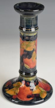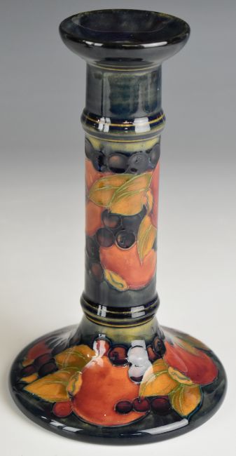 A pair of William Moorcroft candlesticks decorated in the Pomegranate pattern with open pomegranates to the stems, signed and impressed marks to bases