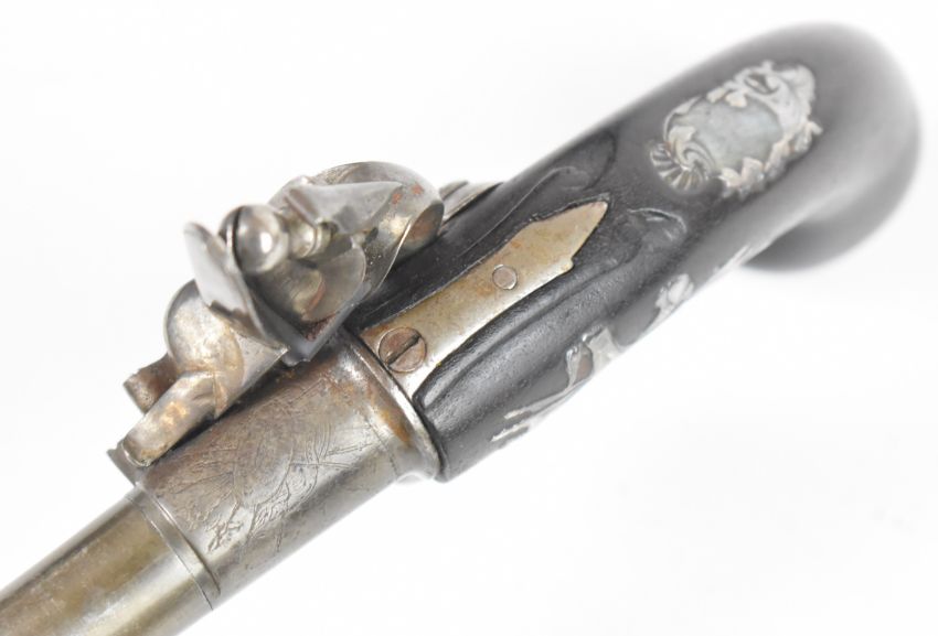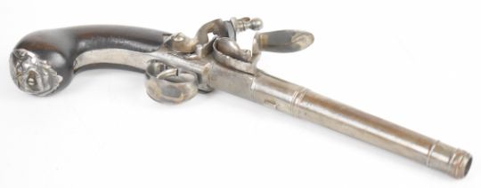 Queen Anne style flintlock pistol with silver mounts, mask butt plate and wrist cartouche, shaped wooden grip and 5.5 inch smooth bored turn-off cannon barrel, overall length 31cm.