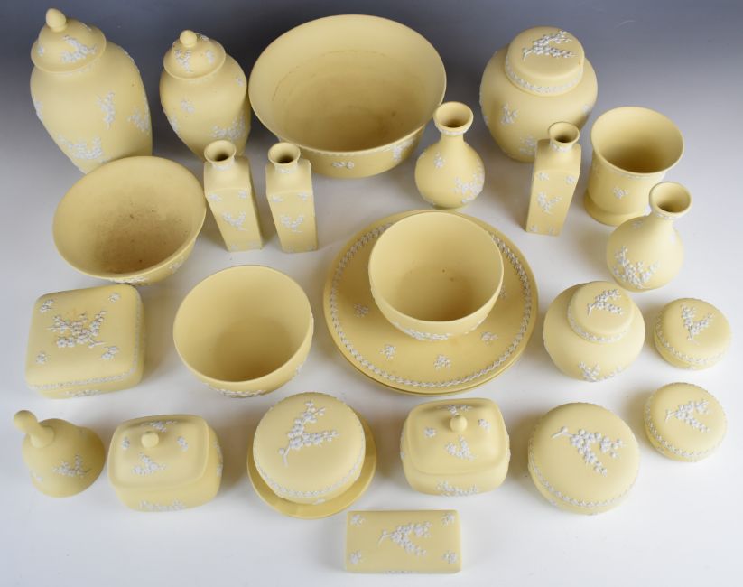 Large collection of Wedgwood primrose yellow Jasperware including covered ginger jars, pedestal bowls, vases, covered boxes etc, approximately twenty five pieces, tallest 18cm