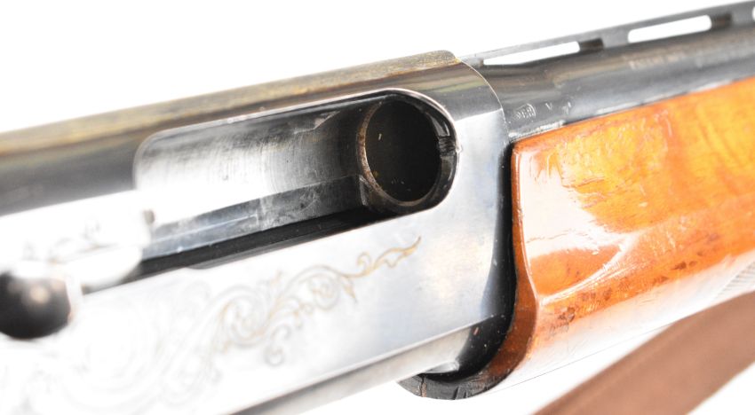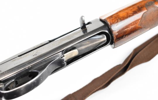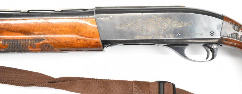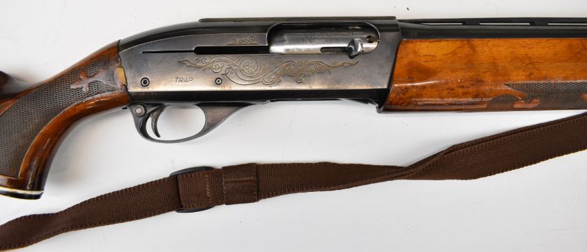 Remington Model 1100 Trap 12 bore 5-shot semi-automatic FAC shotgun with ornately carved and chequered semi-pistol grip and forend, engraved action and bolt,canvas sling, vented rib and 27 inch multi-choke barrel, overall length 121cm, length of pull 36cm, serial number 126241V. PLEASE NOTE THAT A VALID RELEVANT FIREARMS CERTIFICATE IS REQUIRED TO VIEW OR PURCHASE THIS LOT AND FOR ALL SHOTGUNS OR RIFLES. PLEASE ENSURE YOU HAVE THE RELEVANT CERTIFICATE BEFORE BIDDING.