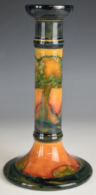 William Moorcroft candlestick decorated in the Eventide pattern, circa 1920s, with signed and impressed mark to base, H26cm