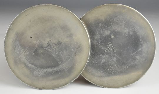 A pair of William Moorcroft candlesticks decorated in the Pomegranate pattern, with Tudric pewter mounts and impressed 'Tudric Moorcroft 01362' to bases, H19.5cm, base diameter 13.5cm