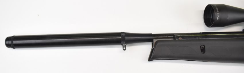 BSA Lightning .22 air rifle with composite stock, semi-pistol grip, raised cheek piece, sound moderated barrel, adjustable trigger and Hawke Sport HD 3-9x40 scope, serial number S-830774-10. IF YOU REQUIRE POSTAGE THEN PLEASE NOTE THAT ALL POST-1939 AIR WEAPONS CAN ONLY BE SENT TO A REGISTERED FIREARMS DEALER AND NOT TO A HOME ADDRESS