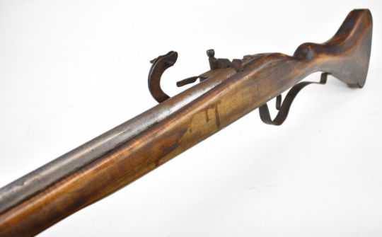 Civil War style blank firing 20 bore muzzle loading matchlock musket with scrolling trigger guard, metal mounts, brass tipped wooden ram-rod and 36 inch barrel, overall length 135cm, NVSN. PLEASE NOTE THAT A VALID RELEVANT SHOTGUN CERTIFICATE IS REQUIRED TO VIEW OR PURCHASE THIS LOT AND FOR ALL SHOTGUNS OR RIFLES PLEASE ENSURE YOU HAVE THE RELEVANT CERTIFICATE BEFORE BIDDING.