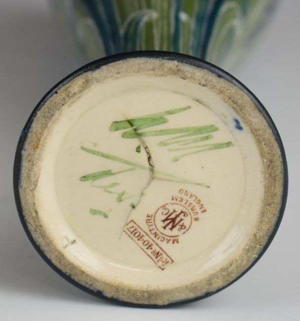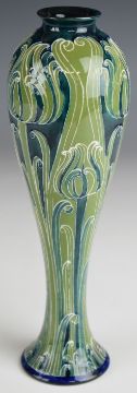 William Moorcroft Macintyre Florian Ware slender vase decorated with tulips on a tapering pale green to blue ground, with signed and printed marks to base, circa 1904, H23cm