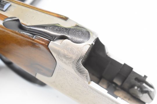 Lanber 12 bore over and under ejector shotgun with engraved locks, underside, trigger guard, top plate and thumb lever, chequered semi-pistol grip and forend, single trigger, vented top rib and 28 inch barrels choked ¼ and ½, overall length 110cm, length of pull 34cm, serial number 1G197161. PLEASE NOTE THAT A VALID RELEVANT SHOTGUN CERTIFICATE IS REQUIRED TO VIEW OR PURCHASE THIS LOT AND FOR ALL SHOTGUNS OR RIFLES. PLEASE ENSURE YOU HAVE THE RELEVANT CERTIFICATE BEFORE BIDDING.