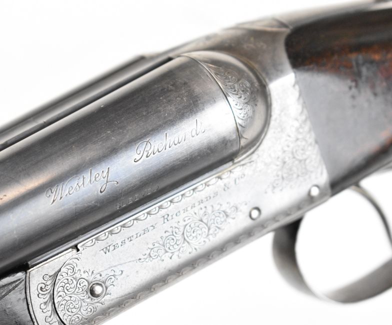 Westley Richards 12 bore side by side ejector shotgun with named and engraved locks, engraved underside, trigger guard, top plate, thumb lever and fences, chequered grip and forend, vacant cartouche to the underside of the stock, double trigger and named 27 inch barrels choked ¾ and improved cylinder, overall length 112cm, length of pull 38cm, serial number 8597. PLEASE NOTE THAT A VALID RELEVANT SHOTGUN CERTIFICATE IS REQUIRED TO VIEW OR PURCHASE THIS LOT AND FOR ALL SHOTGUNS OR RIFLES. PLEASE ENSURE YOU HAVE THE RELEVANT CERTIFICATE BEFORE BIDDING.