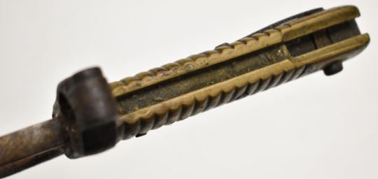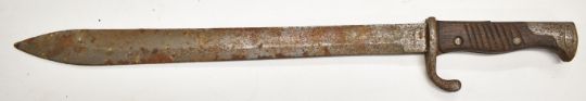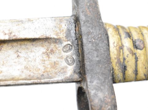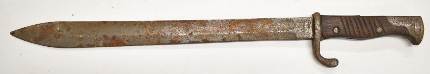 French Chassepot bayonet dated 1871 to back of blade and with brass handle, in scabbard, overall length 71cm, together with an Alex Coppel Solingen German Mauser butcher bayonet, overall length 49.5cm. PLEASE NOTE: WE ARE NOT ABLE TO OFFER OUR USUAL POSTAGE SERVICE FOR THIS LOT