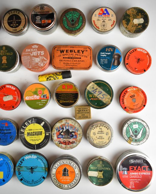Forty one tins or boxes of air rifle pellets including Webley .22 Special, Eley Wasp, Beatall, The Famous 'Queen' Air Gun Slugs, Eley Magnum, Bulldog, Challenger Orient Express, Jackal Jets, Air Arms, Bisley Super Field, JSB Diabolo Exact Jumbo Express, Haendlet & Natermann Rabbit Magnum, Marksman, Dynamit Nobel R10, Challenger Ely Buffalo, RWS Superdome, BSA Elite etc.