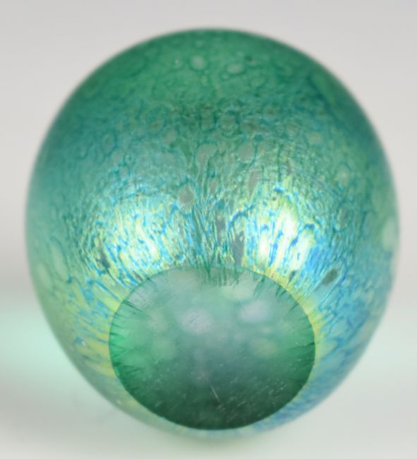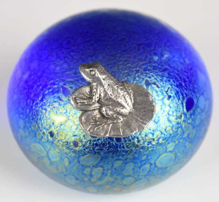 Four Heron Glass iridescent glass paperweights, including one with applied lizard, one with applied dragonfly and one with applied frog on a lilypad, largest 11.5cm in diameter, one with original label to base.