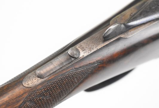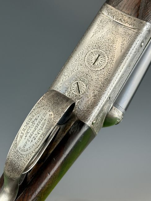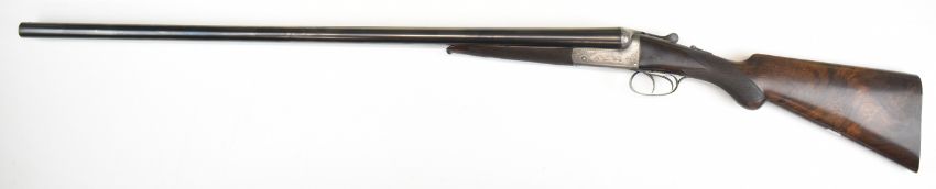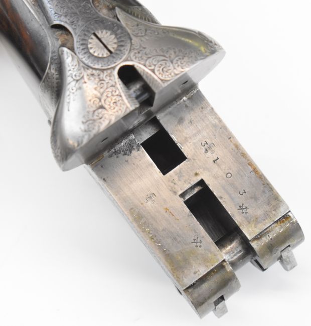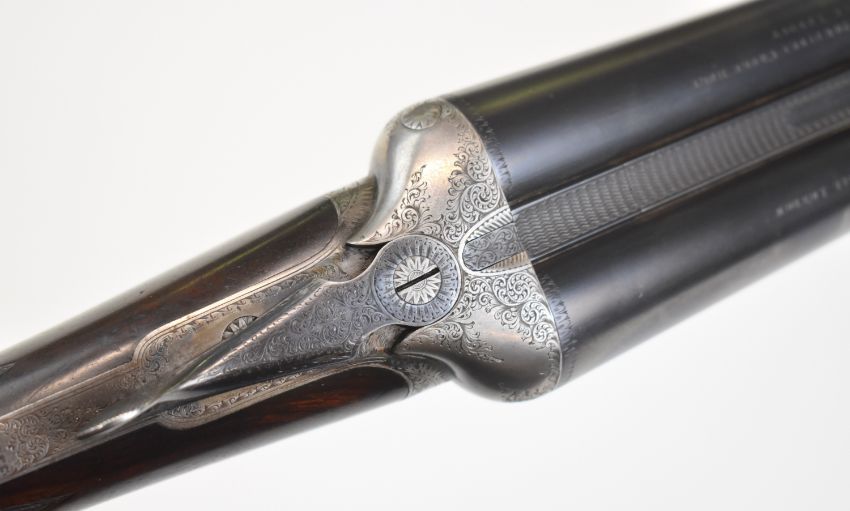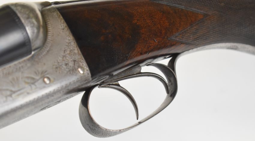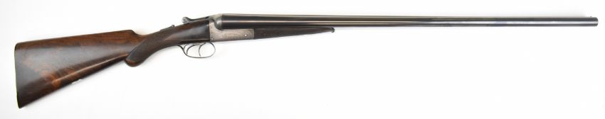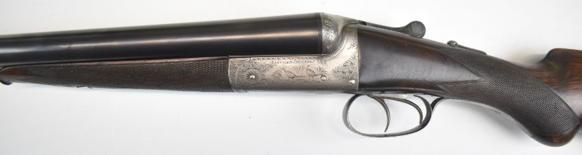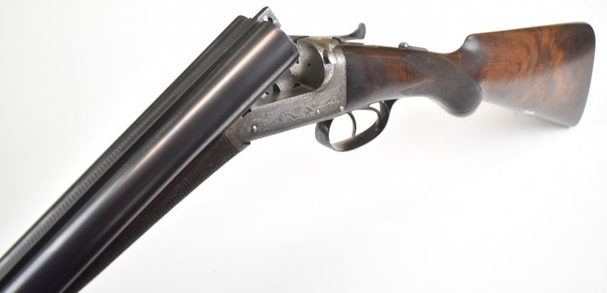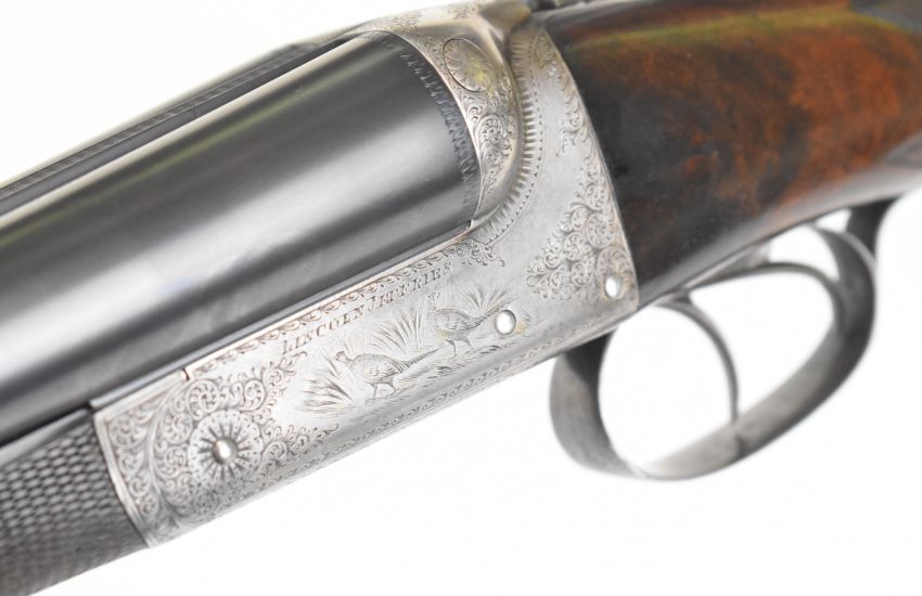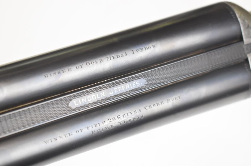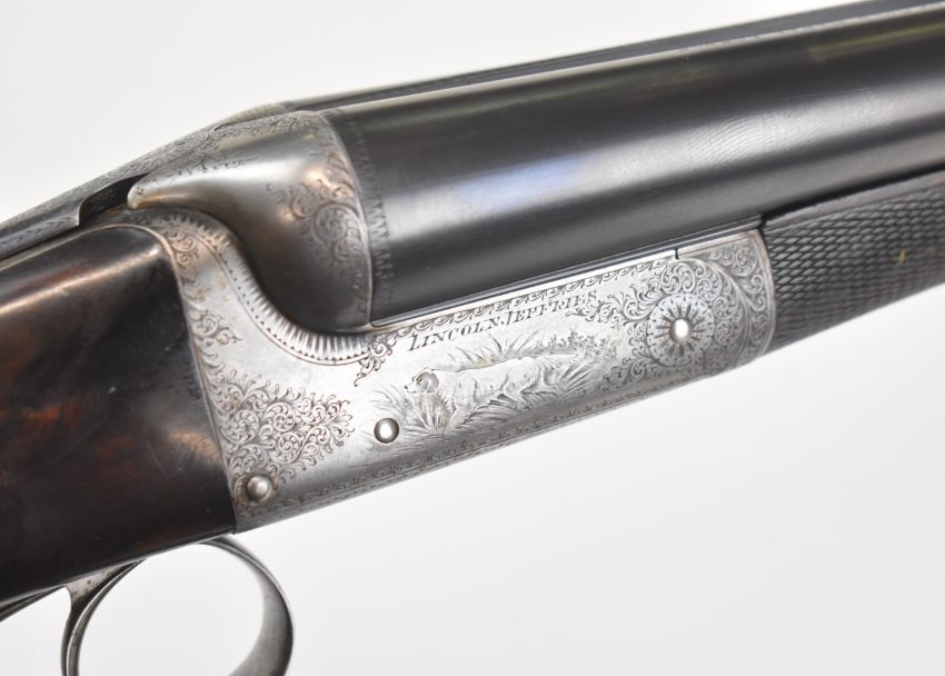 Lincoln Jefferies 12 bore side by side shotgun with engraved scenes of birds to the named locks, engraved underside, top plate, thumb lever and fences, trigger guard engraved 'Gun & Rifle Manufacturer 121 Steelhouse Lane Birmingham', chequered semi-pistol grip and horn tipped forend, vacant shield shaped cartouche to the underside of the stock, double trigger and named 30 inch barrels choked improved cylinder and ¾ and engraved 'Winner of Gold Medal London Winner of Field 20 Guinea Choke Bore Prize London', overall length 117.5cm, length of pull 36cm, serial number 3103. PLEASE NOTE THAT A VALID RELEVANT SHOTGUN CERTIFICATE IS REQUIRED TO VIEW OR PURCHASE THIS LOT AND FOR ALL SHOTGUNS OR RIFLES PLEASE ENSURE YOU HAVE THE RELEVANT CERTIFICATE BEFORE BIDDING.