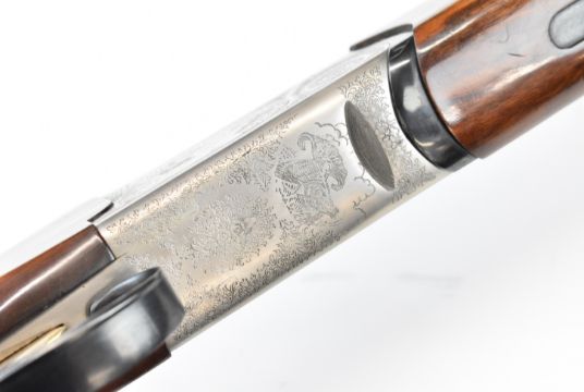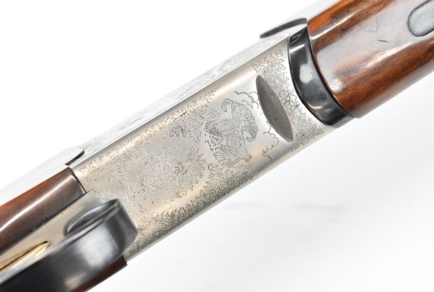 Bettinsoli 12 bore over and under ejector shotgun with engraved scenes of birds to the locks and underside, engraved top plate and thumb lever, chequered semi-pistol grip and forend, single trigger, vented top and central ribs and 27.5 inch barrels choked ¾ and full, overall length 113.5cm, length of pull 36.5cm, serial number 82834. PLEASE NOTE THAT A VALID RELEVANT SHOTGUN CERTIFICATE IS REQUIRED TO VIEW OR PURCHASE THIS LOT AND FOR ALL SHOTGUNS OR RIFLES. PLEASE ENSURE YOU HAVE THE RELEVANT CERTIFICATE BEFORE BIDDING.