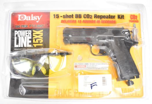 Three Daisy Power Line .177 air pistols, 617X, 15XK and 5693, all in original packaging, two with glasses. IF YOU REQUIRE POSTAGE THEN PLEASE NOTE THAT ALL POST-1939 AIR WEAPONS CAN ONLY BE SENT TO A REGISTERED FIREARMS DEALER AND NOT TO A HOME ADDRESS